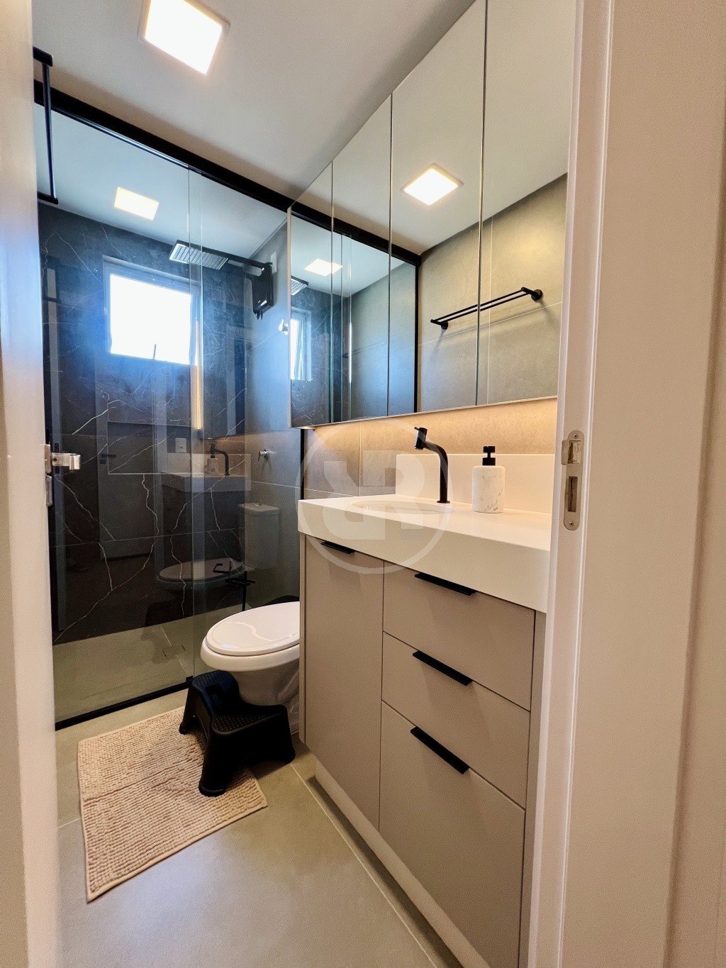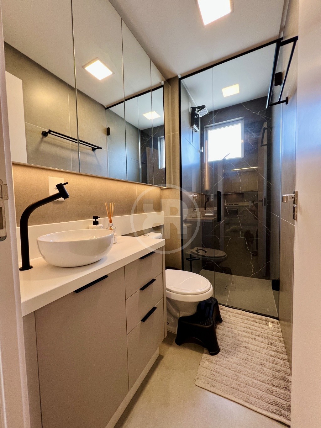 Os banheiros possuem acabamento moderno com box até o teto, agregando elegância e praticidade ao ambiente.