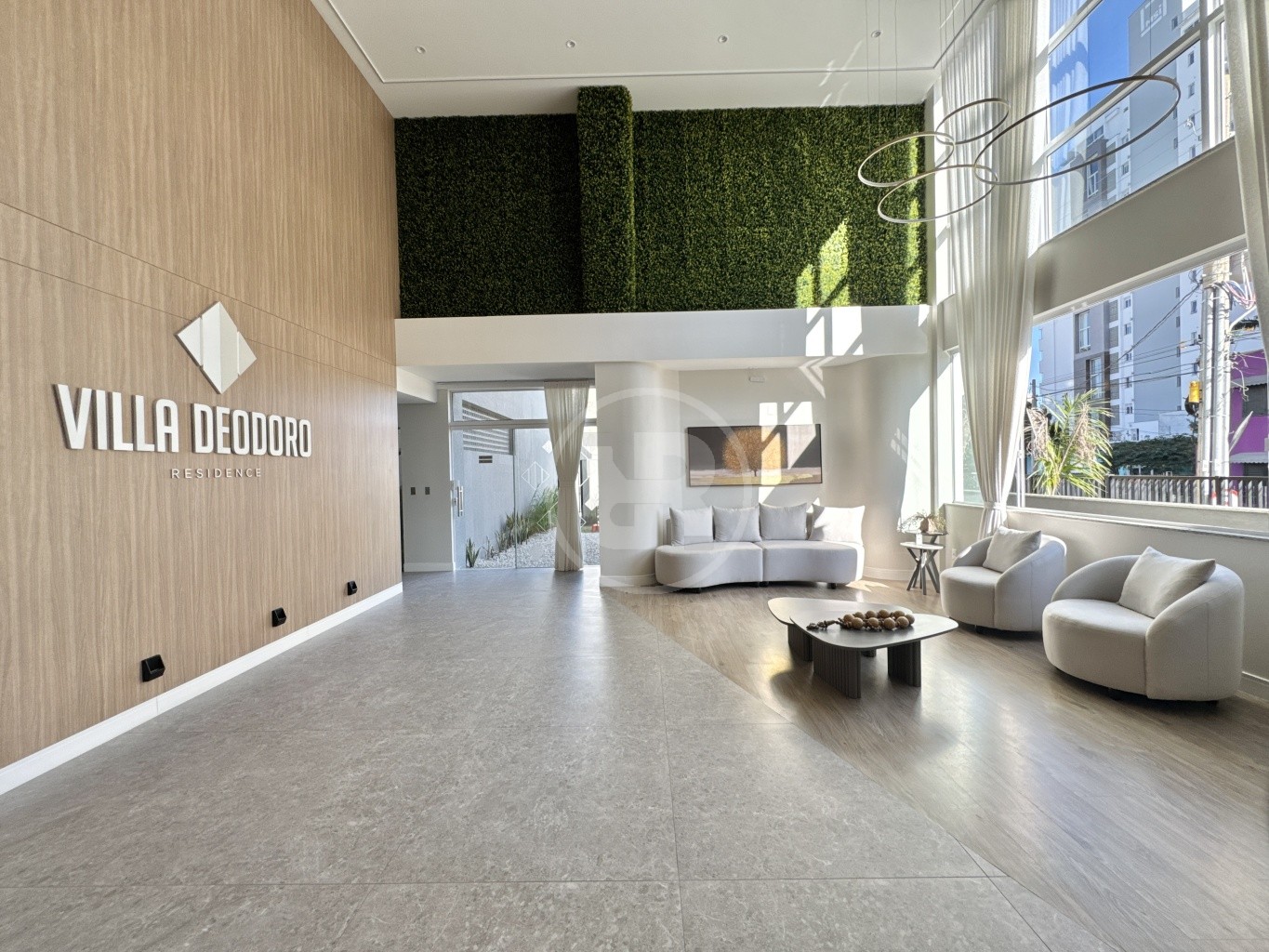 - Hall de entrada com pé-direito duplo e lounge decorado